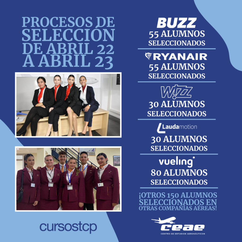 Desde abril del 2022 hasta abril de 2023, 400 alumnos de nuestro curso TCP han conseguido trabajo como auxiliar de vuelo en diversas compañías aéreas. ¡Enhorabuena […]