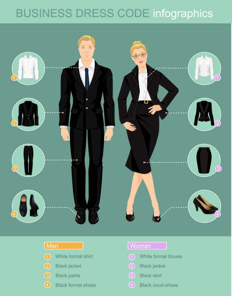 - Traje de chaqueta o pantalón de vestir con camisa y americana, o en su defecto, rebeca de punto. Podemos elegir trajes de color negro, gris, azul marino, etc. y combinarlos con camisas blancas o de tonos azules.